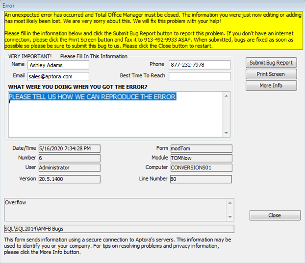 When runtime exceptions are received, they are delivered directly to our development team. The review the code to replicate and correct the issue as best they can with the information provided. It is important a user enter as much descriptive information as possible indicating what they were doing when the runtime exception occurred. The more information provided the better chance the developer has to locating and correcting the runtime exception. Please Help Aptora Fix What’s Bugging You.