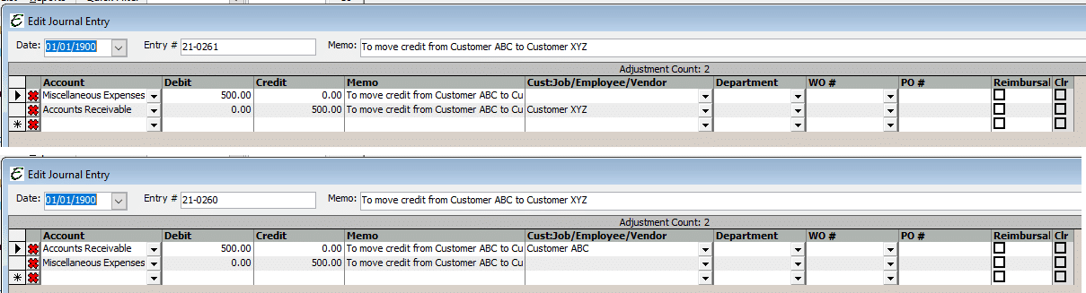 To fix this, you will need to create two Journal Entries. One will move the credit balance from the incorrect customer to a “wash” account and the other will move the funds from the “wash account” to the correct customer to close the open balance. The reason for two journal entries is because Total Office Manager will allow you to use Accounts Receivable more than once on a JE.