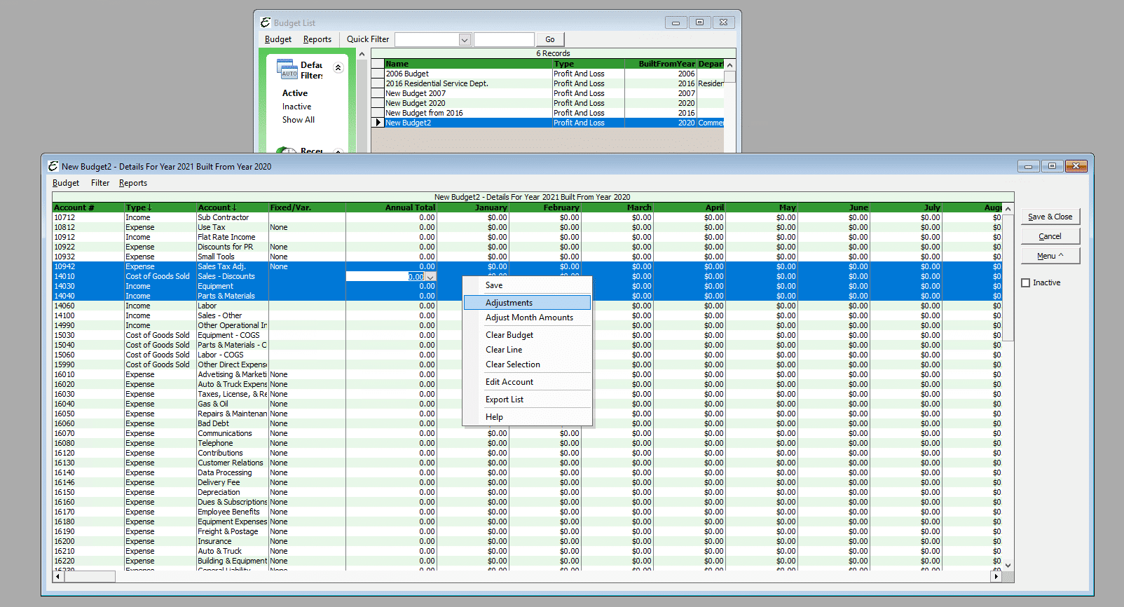 - From the main menu, click Company | Budget List. This will bring up the list of every budget stored in Total Office Manager. Double click the Budget needing modified to see the itemized budget.