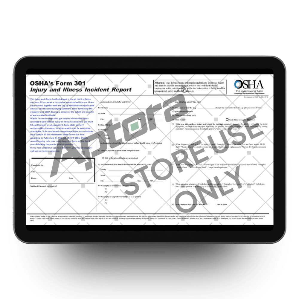 We have built the OSHA Form 301 into a standard sized 8 1/2 x 11″ size page. The form provided by OSHA is 8 1/2″ x 14″, but that size is less convenient to print and manage. OSHA will accept a standard size page like ours. You can learn more by visiting their website.